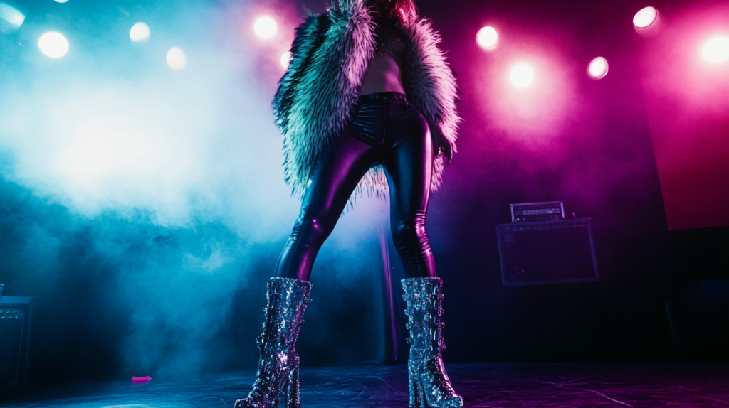 Buty glam rock to nieodłączny element stylizacji. Platformy, zarówno te na koturnie, jak i na grubej podeszwie, były absolutnym must-have. Często zdobione były cekinami, brokatem lub metalowymi elementami. Buty glam rock miały za zadanie nie tylko dodać wzrostu, ale również podkreślić ekstrawagancki charakter stylizacji. Platformy były symbolem buntu i odrzucenia konwencji, idealnie wpisując się w ducha glam rocka.